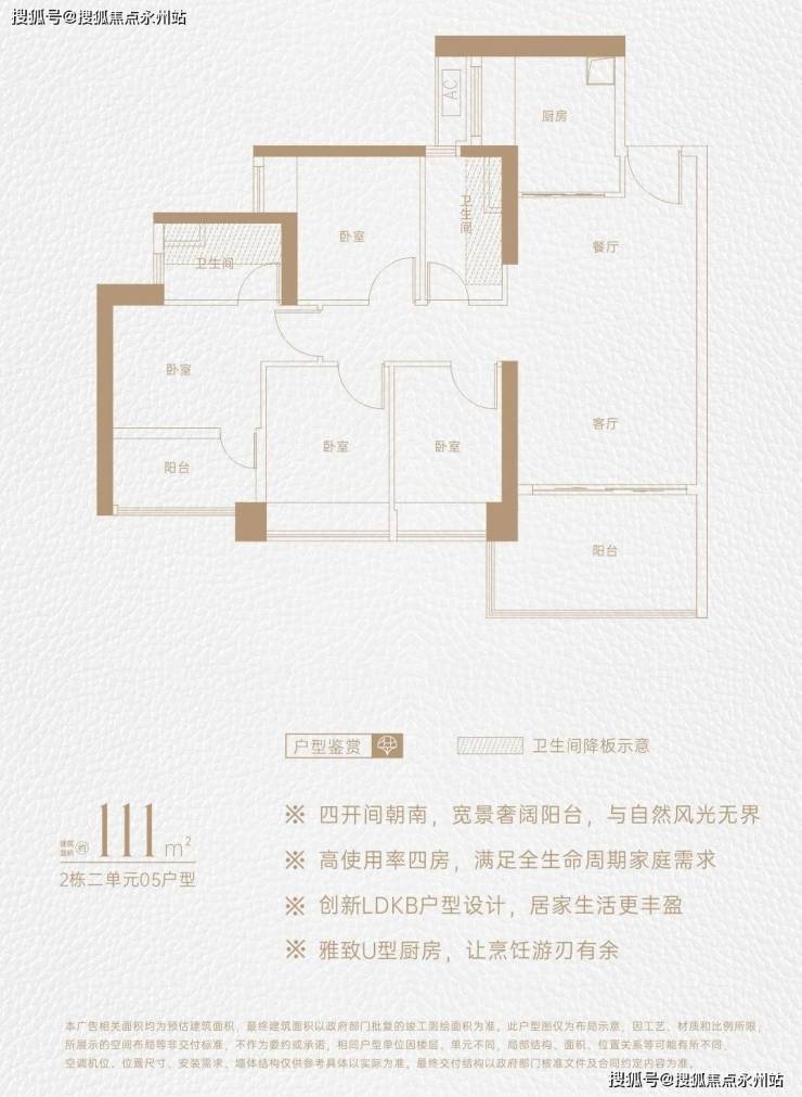 111㎡ 3房2厅2卫:四开间朝南,经典竖厅格局,U型厨房,西南朝向宽景阳台,得房率约73%(不含赠送)