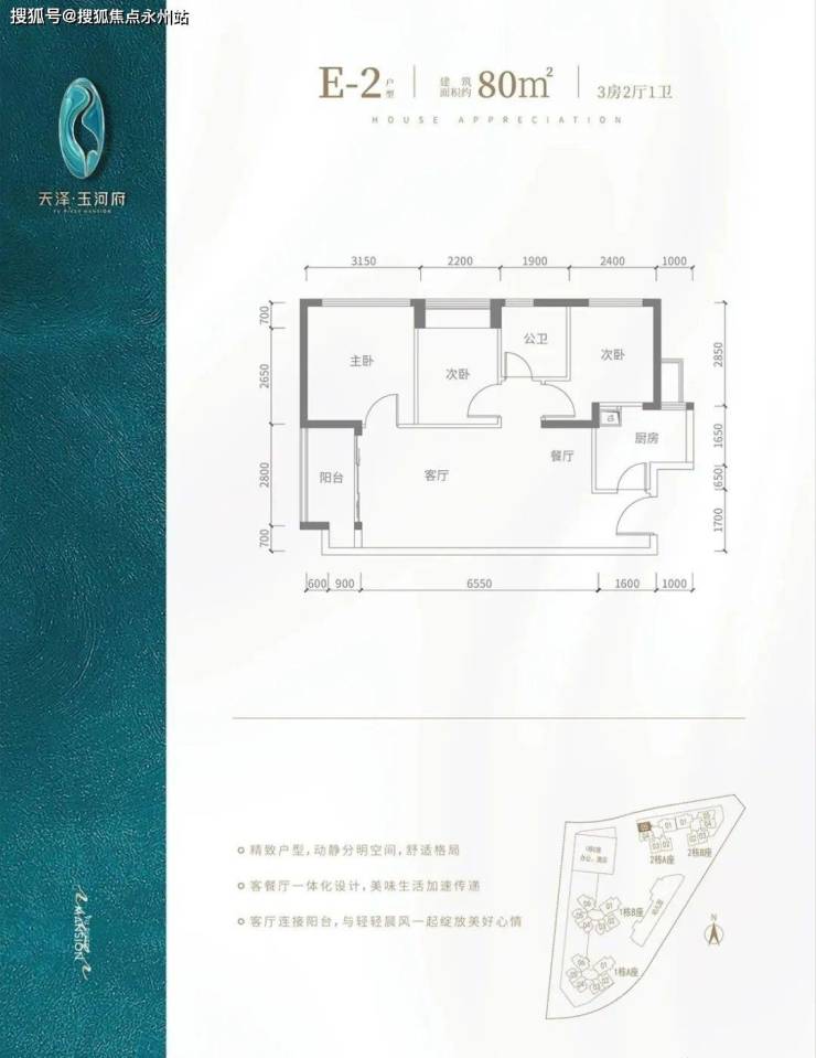 E2户型-80㎡-3房2厅1卫,设计的是竖厅格局,客厅3.5米开间,餐客厅一体化,阳台2.8米长,朝西向。