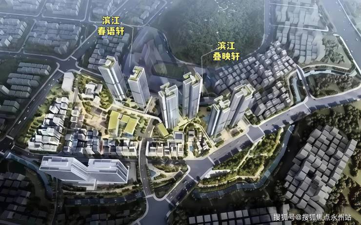 楼栋规划:分叠映轩(南侧)、春语轩(北侧)两个地块打造,地块间有连廊相接;共6栋总高43-50层住宅,其中叠映轩4栋(46-50层)、春语轩2栋(43-47层),春语轩含1栋5层幼儿园,叠映轩配建有公交首末站、社区健康服务中心、游泳池及球场活动场地。