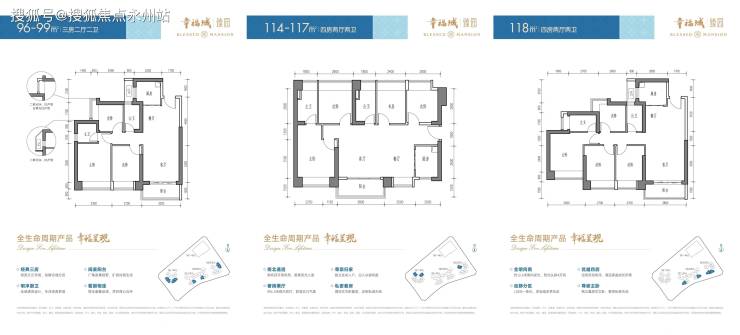 96-99㎡三房两厅两卫:竖厅格局,动静分区,得房率约81%-84%。