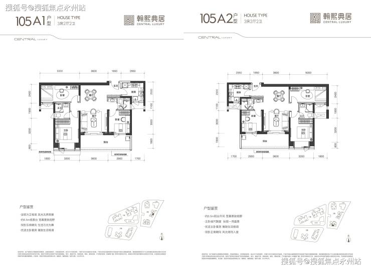 105㎡3房2卫:双龙抱珠格局,朝东/南,阳台开间6.5米,折后总价约894万起(单价8.5万起)。