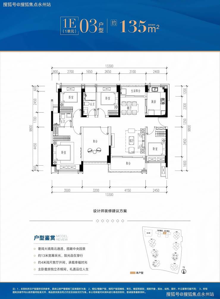布局:竖厅南北通透,四开间朝南,阳台东北向直面园林,避免西晒。