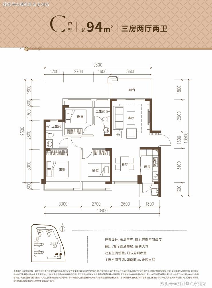 94㎡的3房2厅2卫,设计的竖厅南北通透格局,客厅3.6米开间,带1个5.4米长的大阳台,阳台主朝南向,L型厨房,全屋飘窗设计。
