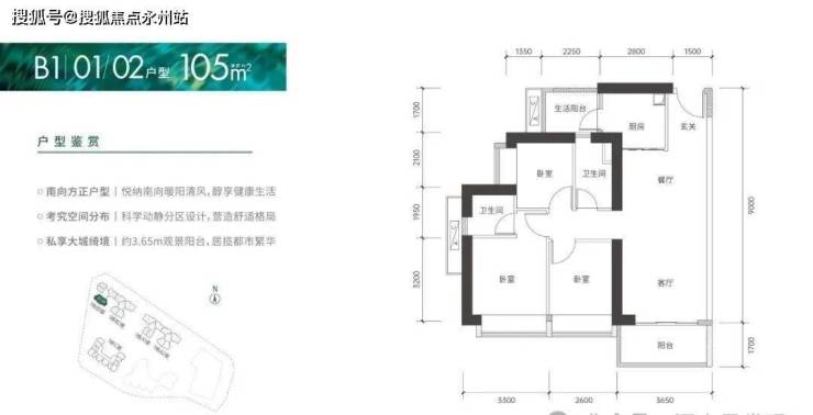 95㎡的3房2厅2卫,仅1栋B2座01户型,设计的是竖厅格局,客厅3.35米开间,进门入户玄关,LDKB一体化设计,3个卧室分别做到了2.95米/2.6米/2.25米的宽度,L型厨房还带1个小生活阳台,卫生间干湿分离,得房率:75.66%(不含赠送),阳台朝西南向。