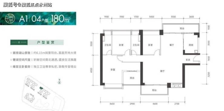 180㎡的4房2厅2卫,设计的是竖厅格局,南北通透双阳台,客厅7.3米大开间,进门入户玄关,4个卧室分别做到了3.65米/3.45米/3.1米/2.9米的宽度,U型厨房,卫生间干湿分离,得房率:75.66%(不含赠送),客厅阳台主朝西南向,餐厅位还有个长6.15米的观景大阳台。