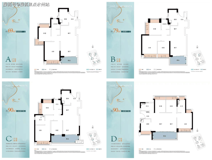 D户型90㎡三房:市面上少见的将此面积段做到大开间横厅布局,外延约5.1米景观阳台,最大限度放大采光角度。预留LDKB一体化设计,满足家人互动、家中观影等功能,次卧可变,多胎家庭也能轻松满足。