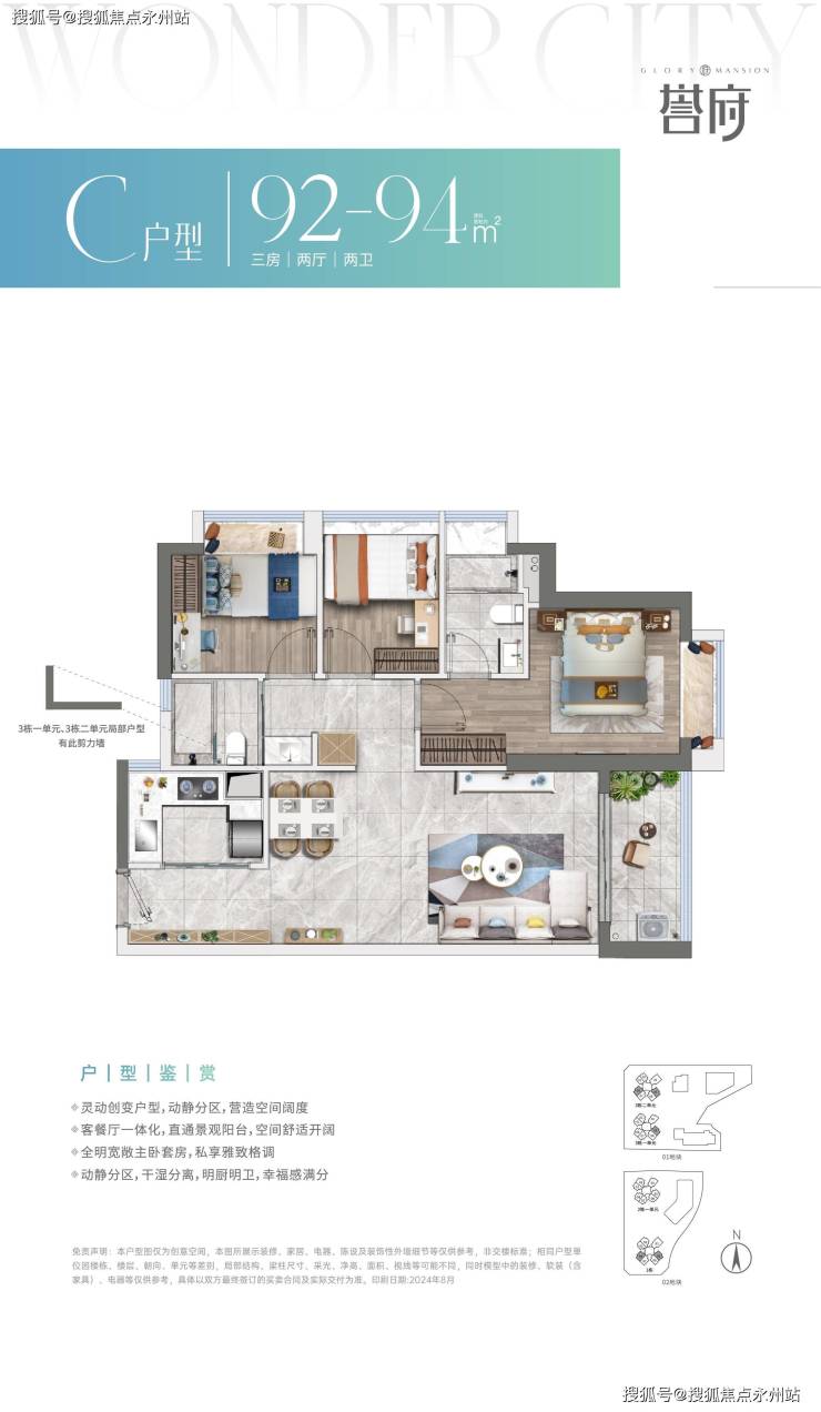 92-94㎡的3房2厅2卫,设计的是竖厅格局,客厅3.3米开间,U型厨房还带一个小生活阳台,公卫三段式分离,得房率74.4%(不含赠送),有西南或东南朝向。