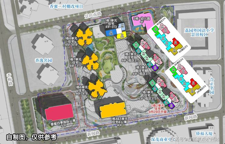 核心区位:位于深圳市福田区香梅路与新闻路交汇处东北角,隶属景田片区,紧邻香蜜湖新金融中心,距市民中心约1.4公里,夹在香蜜湖、车公庙、福田CBD三大核心板块之间。
