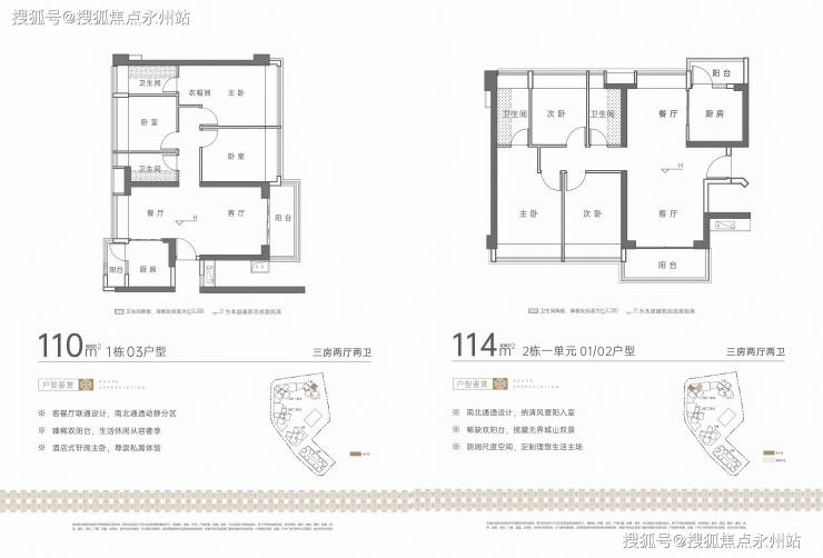 110-114㎡三房两厅两卫:共 141 套,南北通透竖厅格局,三开间朝南,主卧大套间设计,U 型厨房带生活阳台,客厅阳台主朝东南或西南向,得房率约74-75%。