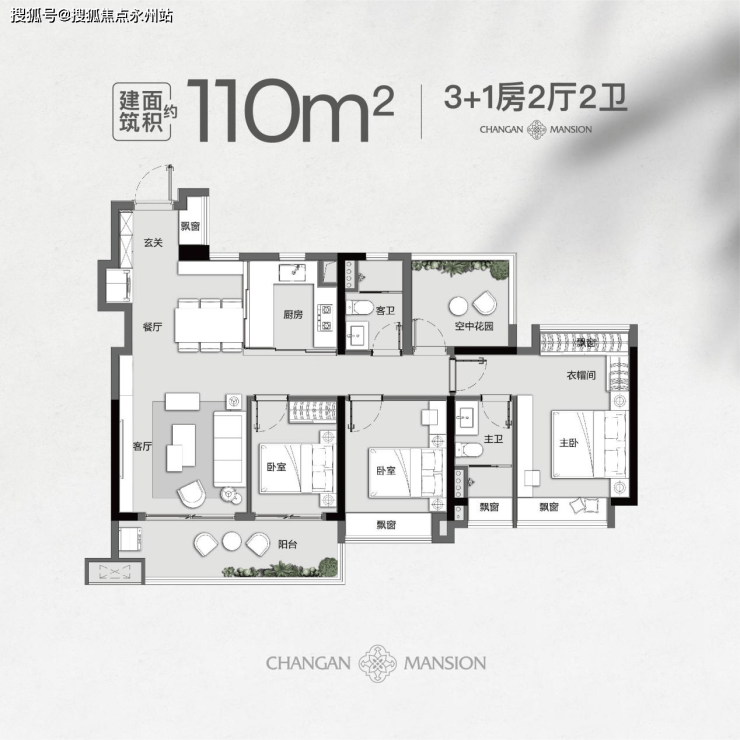 建面约110㎡的3+1房两厅两卫,飘窗使用面积无限拓展,不仅增加了入户玄关,也提高主卧利用率开辟出衣帽间,居住舒适度拉满!