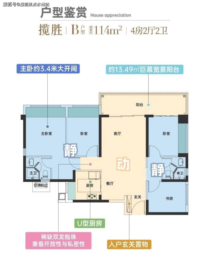 约114㎡4房2厅2卫:采用经典的双龙抱珠格局,客餐厅+阳台一体化设计,动静分区明确。