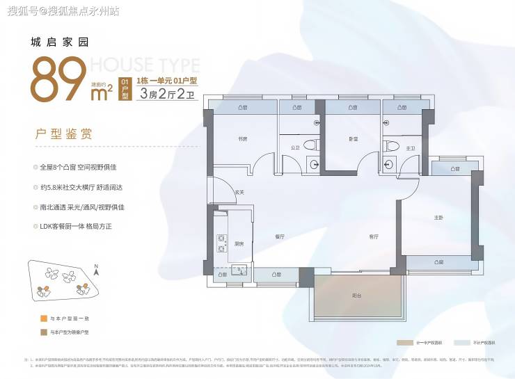 89㎡的3房2厅2卫,02.03户型,设计的是经典竖厅格局,客厅3.4米开间,LDKB一体化,S墙设计预留冰箱卡槽位,动静分区,三开间朝南,3个卧室分别做到了主卧13.79㎡/次卧7.62㎡/次卧6.93㎡(包含墙体飘窗),主卧+1个次卧270°飘窗设计,U型厨房,公卫三段式分离,客厅连接卧室出5.75米长的大阳台,得房率约87.2%(包含赠送),东南朝向。