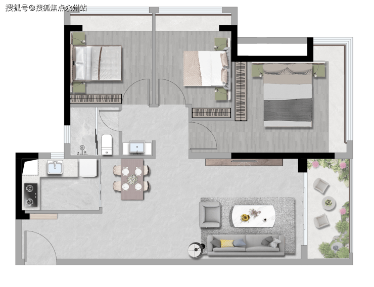 「88㎡的3房2厅1卫」设计的是竖厅格局,客厅3.5米开间,3个卧室分别做到了主卧13.2㎡/次卧9.5㎡/次卧8.1㎡(包含墙体飘窗),厨房还带1个小生活阳台,得房率约80%(不含赠送),西南朝向。
