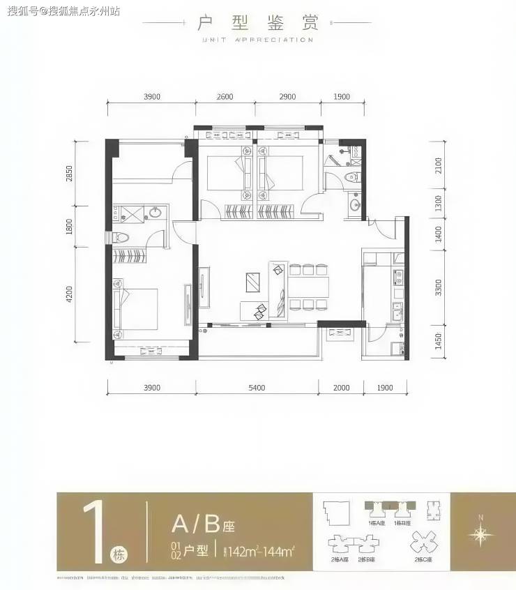 梯户比:1栋 3梯4户, 2AB栋 3梯5户, 2C栋 3梯6户