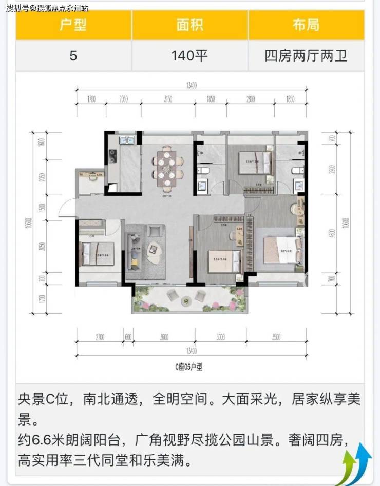 140㎡的4房2厅2卫,设计的是竖厅南北通透格局,客厅3.8米开间,LDKB一体化设计,四开间朝南,4个卧室分别做到了3.5米/3米/2.8米/2.7米的宽度,另外还有1个小储物间,客厅连接次卧出6.6米长的大阳台,L型厨房,卫生间干湿分离,得房率约90%(包含赠送),阳台主朝东南向。