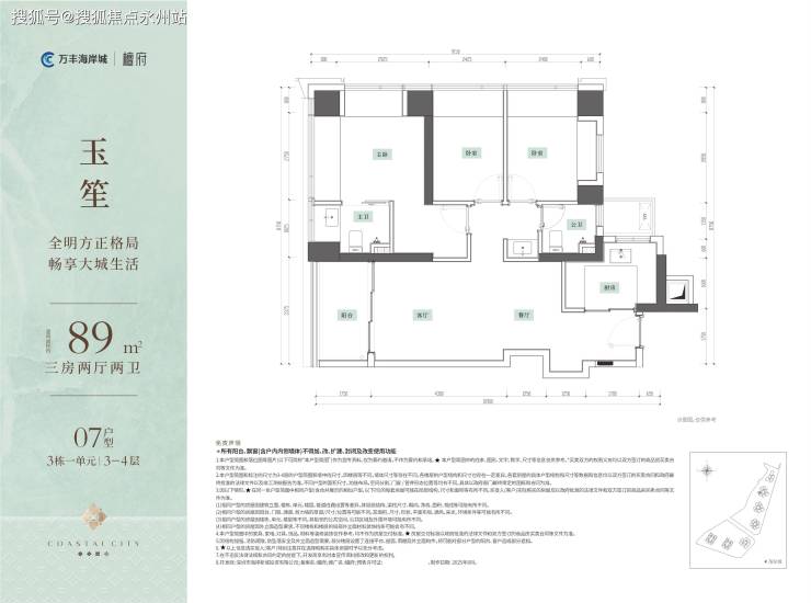 89㎡3房2厅2卫:玄关“S”墙设计,满足冰箱和入户收纳柜,进深约1.75m大阳台,轻松打造私家小花园,U型厨房设计,洗切炒动线合理布局,主卧衣帽间+双面飘窗,小户型大享受。