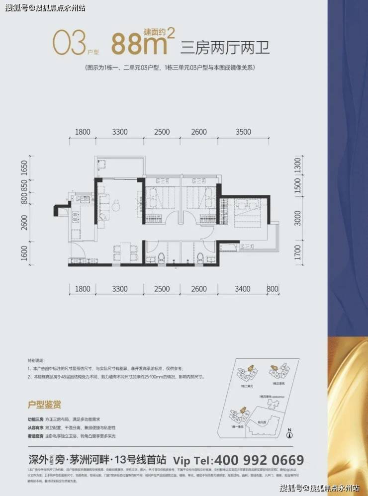 建面约88㎡三房两厅两卫:设计的竖厅格局,客厅3.3米开间,有西北及东北朝向,全明户型 纳阳光清风入怀,主卧套房设计 尽显尊贵从容