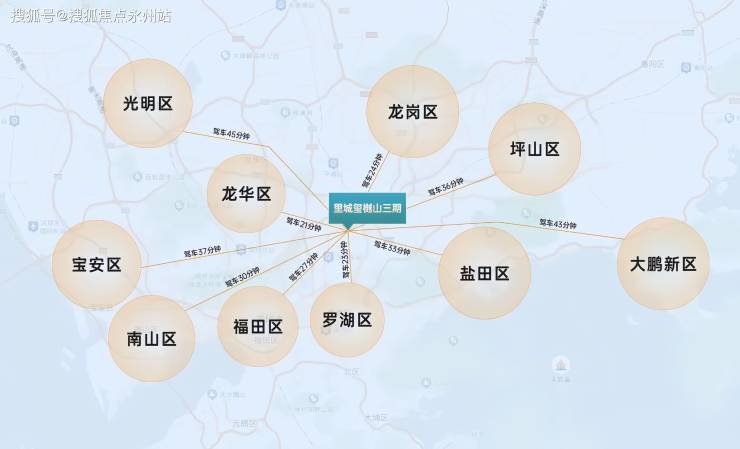 福田区:约27分钟。罗湖区:约23分钟。南山区:约30分钟。龙岗中心城:约24分钟。盐田区:约33分钟。龙华区:约21分钟。
