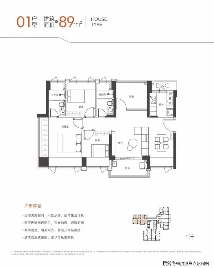 89㎡四房两卫:横厅南北通透格局,四开间朝南,U型厨房,主卧双飘窗,北侧阳台可改书房/小卧室,西南朝向,赠送后得房率约98%。