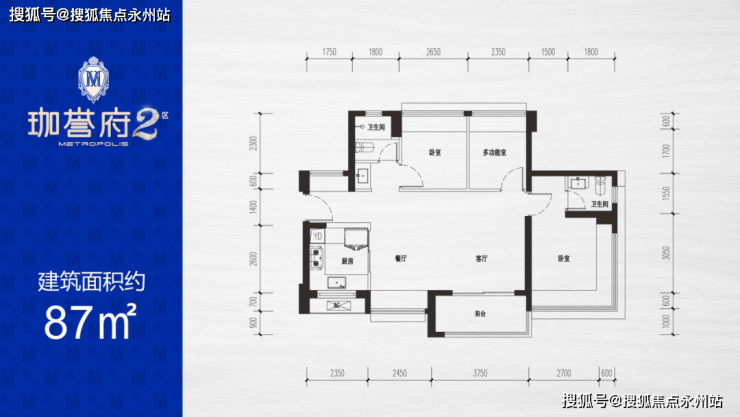 87㎡的3房2厅2卫:设计的是横厅南北通透格局,客餐厅6.2米开间,3个卧室分别为3.3/2.65/2.35米的宽度,主卧270°环幕飘窗视野,U型厨房,阳台进深1.7米,主朝东南朝向。