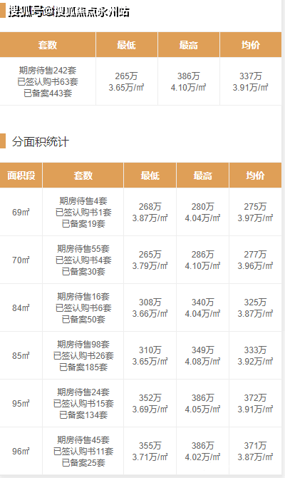 项目于2022年9月16日取证入市,共748套房源,面积69㎡的2房2厅1卫,85㎡的3房2厅1卫,96㎡的3房2厅2卫户型,备案均价3.91万/㎡,备案单价3.65-4.1万/㎡,总价265-386万/套区间,计划于2025年3月底带精装交房