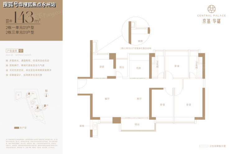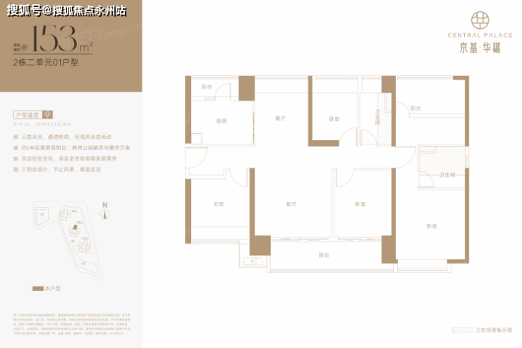 项目主力户型包括95㎡的3房2厅2卫、99㎡的3房2厅2卫、111㎡的3房2厅2卫、120㎡的3房2厅2卫、143㎡的4房2厅2卫及153㎡的5房2厅2卫,143㎡四房为横厅设计。
