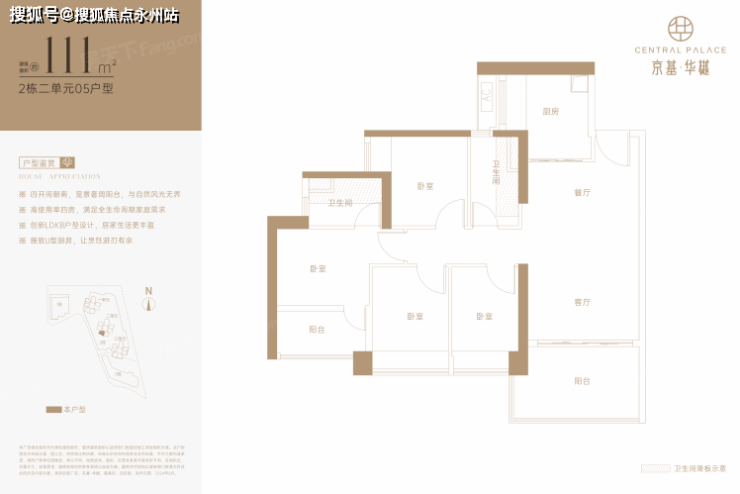 111㎡的3房2厅2卫:仅2栋2单元05户型才有,设计的是经典竖厅格局,LDKB一体化,动静分区,四开间朝南,U型厨房,卫生间干湿分离,得房率约73%(不含赠送),阳台西南朝向。