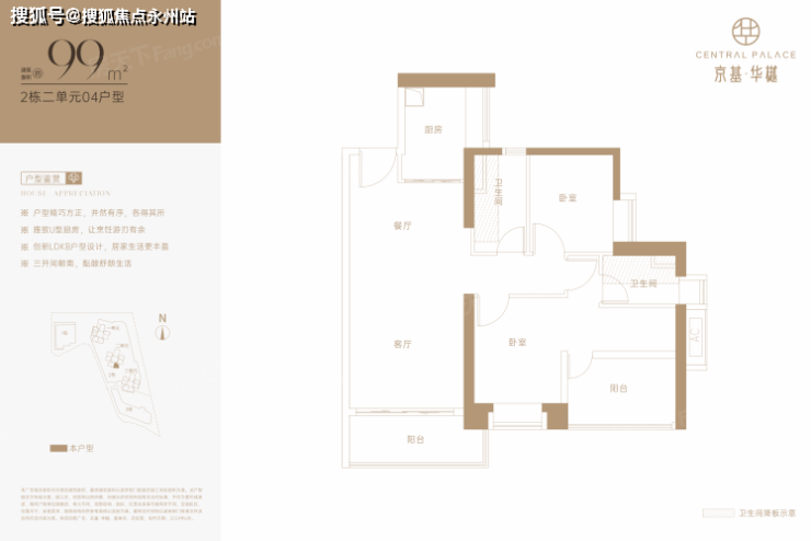 99㎡的3房2厅2卫:仅2栋2单元04户型才有,设计的是竖厅格局,LDKB一体化,动静分区,三开间朝南,L型厨房,卫生间干湿分离,得房率约73%(不含赠送),阳台西南朝向。
