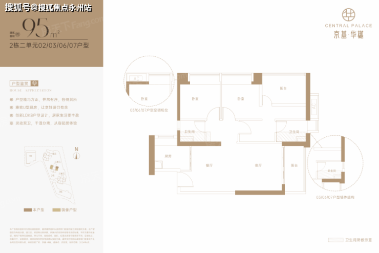 95㎡的3房2厅2卫:设计的是竖厅格局,创新LDKB一体化,L型厨房,卫生间干湿分离,得房率约73%(不含赠送),阳台有东南或西北朝向。
