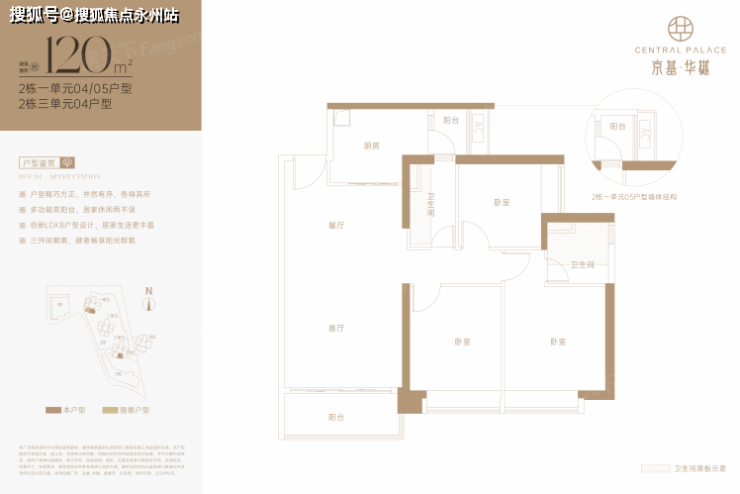 120㎡的3房2厅2卫:设计的是经典竖厅格局,LDKB一体化,动静分区,三开间朝南,L型厨房,还带1个小生活阳台,卫生间干湿分离,得房率约73%(不含赠送),阳台西南朝向。