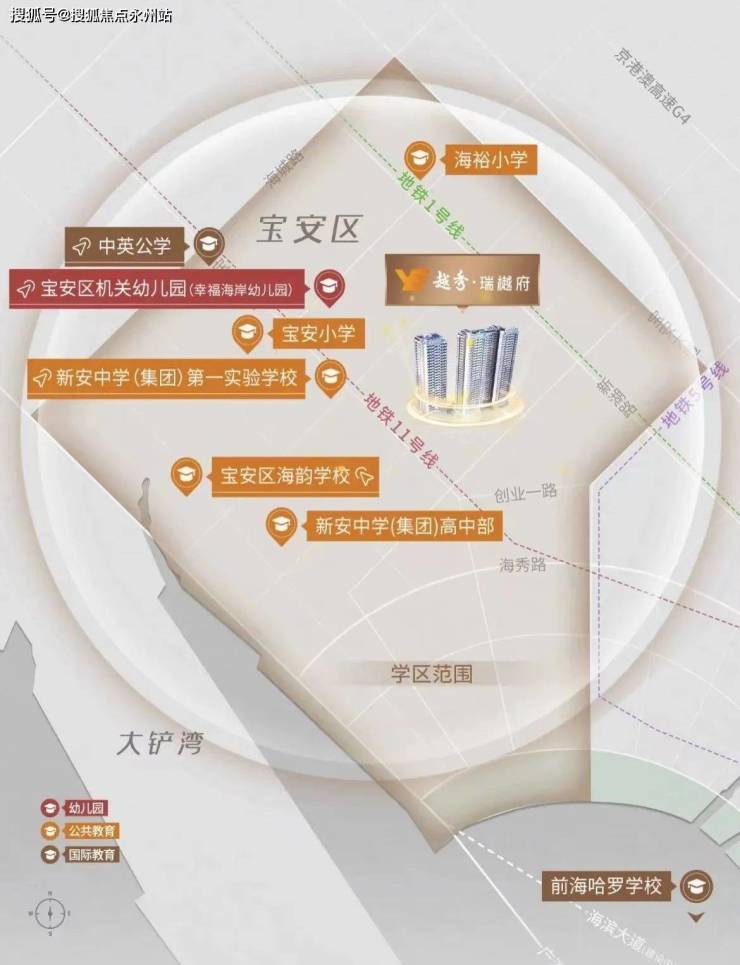 在学校方面,项目北侧是新安中学第一实验学校初中部,距离海韵学校和新安中学第一实验学校高中部均1公里左右,小学学区共享海韵学校小学部,初中共享新安中学(集团)第一实验学校初中部、海韵学校初中部。周边还有宝安机关幼儿园、宝安小学、新安中学高中部、中英公学等学校,名校都在2公里范围内。