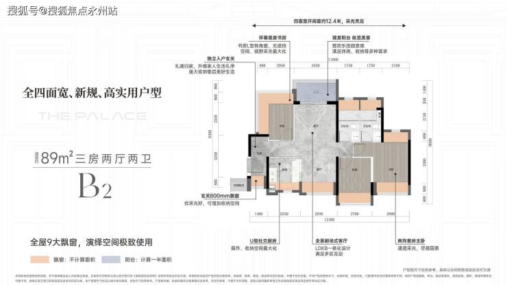 建面约89平方B1B2户型三房两厅两卫主阳台朝北:当下市场最稀缺的客厅南北通透的小面积产品,是真正意义的南北对流,这种设计一般会应用到110平左右的四房。大户型才会设计的入户玄关,项目89平方三房就做了,玄关能提供更大的收纳空间,同时隐私性还特别好,关键是玄关那里还有一个采光窗。