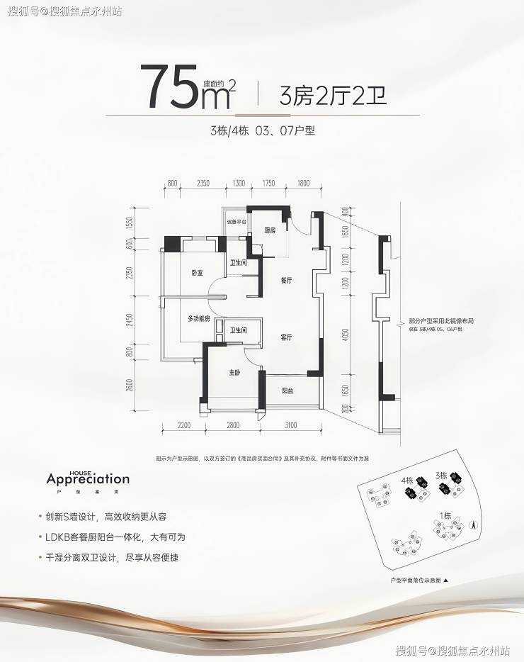 75平3房2卫:新规升级75㎡做2卫,市场同面积做1卫卧室180度环幕采光S型墙体设计冰箱位,使用空间更合理干湿分离两空间公卫,兼并走廊空间更宽阔客餐厅一体化设计,家人间互动交流感更强。西南朝向看内部园林景观,东北朝向看观澜河、碧道景观、观澜古墟景观