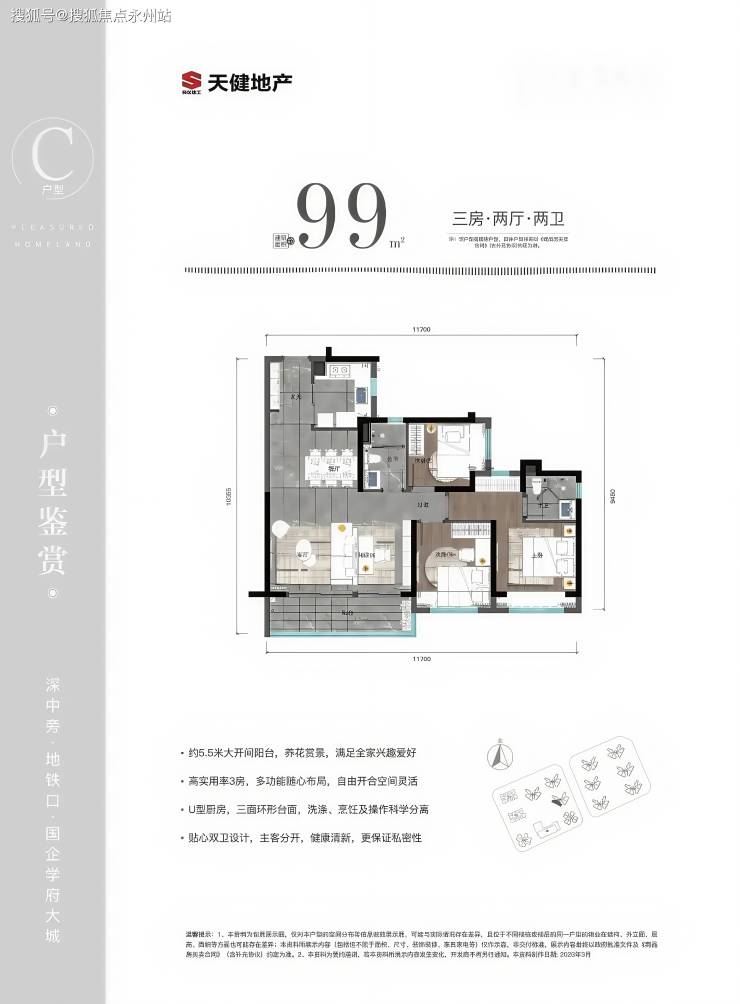 99㎡的3房2厅2卫,设计的是经典竖厅格局,可以改4房,进门入户玄关,客厅5.3米开间,三开间朝南,U型厨房,公卫三段式分离,得房率81.7%(不含赠送),阳台朝西南向。