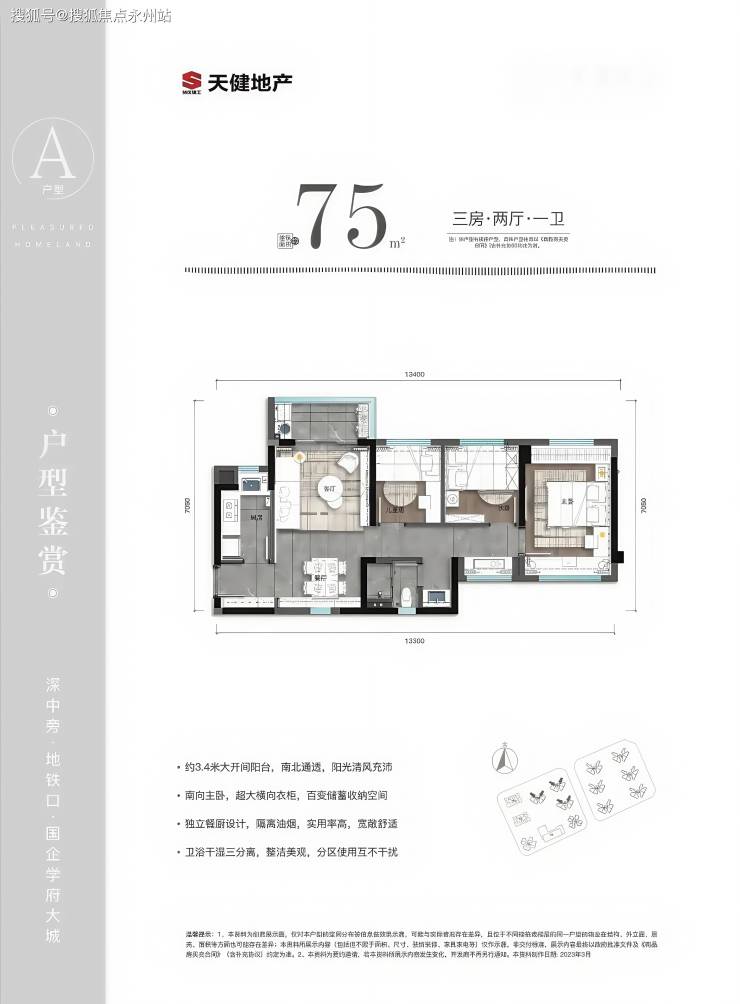 75㎡的3房2厅1卫,设计的是竖厅南北通透格局,进门入户玄关,客厅3.4米开间,L型厨房,卫生间三段式分离,得房率81.3%(不含赠送),阳台朝西北或东北向。