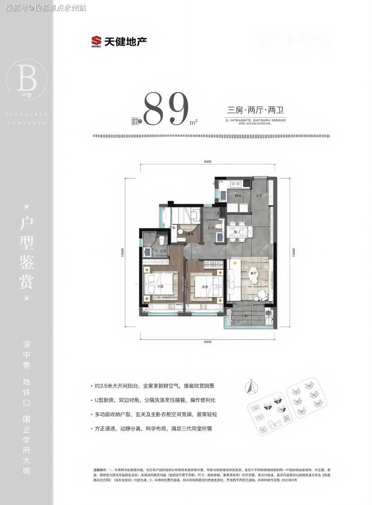 89㎡的3房2厅2卫,设计的是经典竖厅格局,进门入户玄关,客厅3.5米开间,三开间朝南,U型厨房,公卫三段式分离,得房率81.3%(不含赠送),阳台朝西南或东南向。