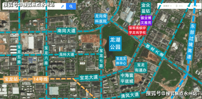 项目紧挨着深圳高级中学龙岗学校,北侧是金众蓝钻,周边有占地25万㎡的龙湖公园,龙岗骨科医院,14号地铁线“宝龙站”距离约1.9公里,还有东部过境高速即将开通。