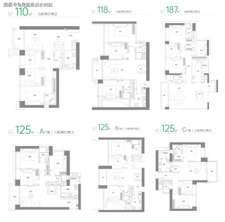 125㎡户型:A户型为瞰景三房,飘窗、阳台拉开居住视野;B户型总体和118平格局类似,放大了部分功能区的面积,且增加了一个生活阳台;C户型也采用了双龙抱珠设计,但位于端头位且东南朝向,三面采光。