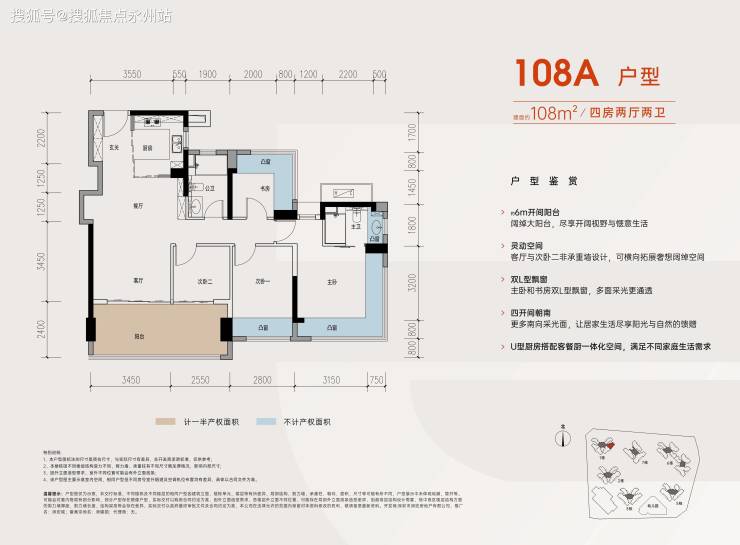 108㎡四房两厅两卫(竖厅A户型)格局:四开间朝南,主卧带270°转角飘窗,客厅连接次卧的6米长大阳台,双套房设计(主卧+老人房)。