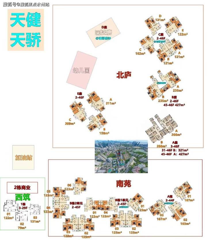 1栋A座:148米,46层,共85户,朝南为主,三梯两户,约266-321平,427平(顶复)