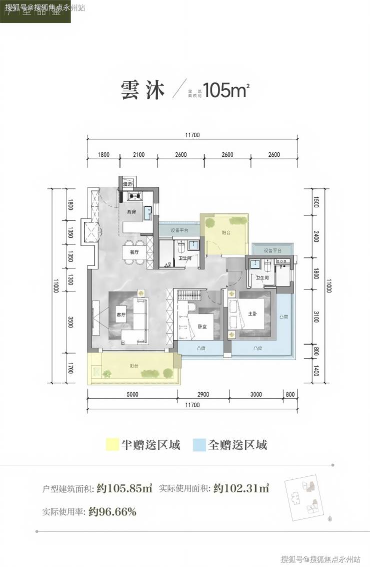 105㎡三+一房两卫:竖厅5米超大客厅开间,三卧室朝南。