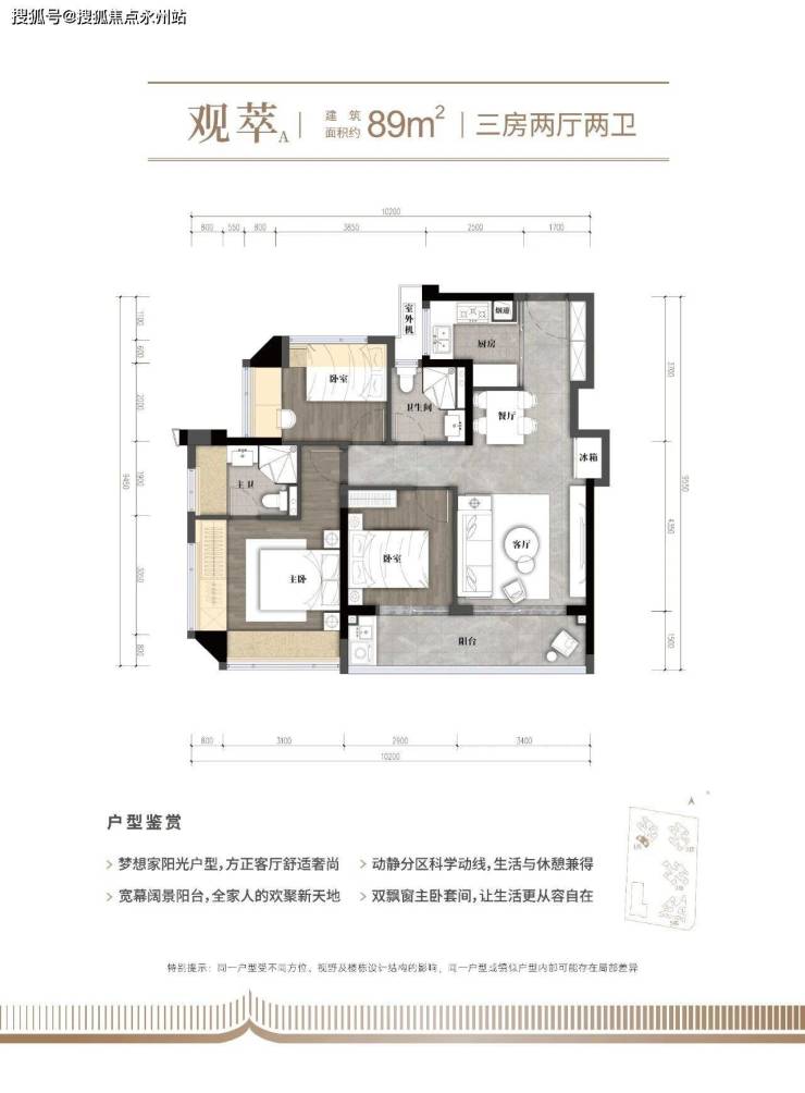 89㎡竖厅三房两厅两卫:竖厅格局,客厅开间3.4米,连接6.3米长大阳台,次卧带双飘窗。