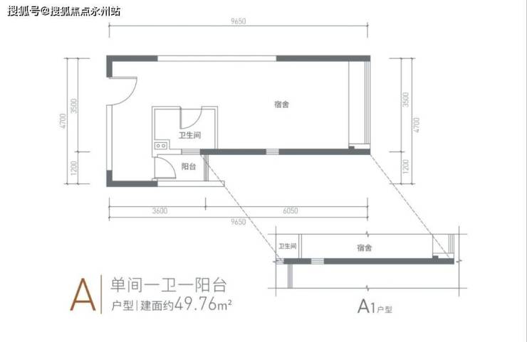 1室1厅1卫:建面约 49-51㎡,户型方正,动静分离,3.1 米层高,带阳台。