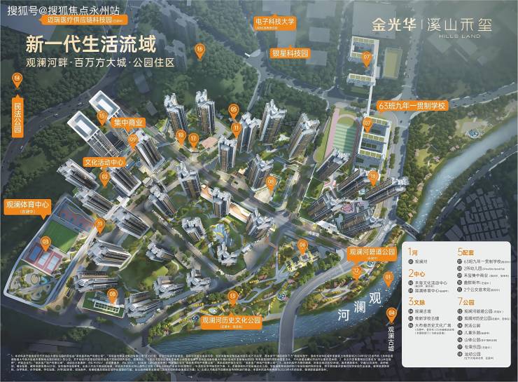 项目依河而建,公园环绕,总建面约120万㎡,划分了6个地块进行开发建设,打造一站式综合大城生活圈。