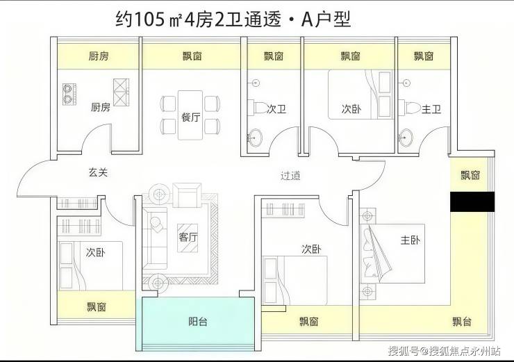 105㎡4房2厅2卫户型:项目的入门级改善产品,该户型采用竖厅南北通透格局,餐客厅分离设计,四开间朝南,全屋十面飘窗,主卧配备 270° 无柱转角飘窗,U 型厨房设计,卫生间干湿分离,得房率约100%(包含赠送面积),阳台朝向东南