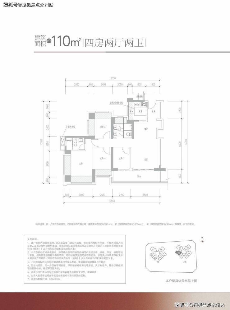110㎡的4房2厅2卫:设计的是经典竖厅格局,客厅3.8米开间,进门独立玄关,LDKB一体化设计,S墙设计预留冰箱卡槽位,4个卧室分别做到了3.8米/3.2米/2.55米/2.44米的宽度,U型厨房,公卫三段式分离设计,得房率约:95%(包含赠送),客厅连接次卧出6.2米的大阳台,朝西南向。