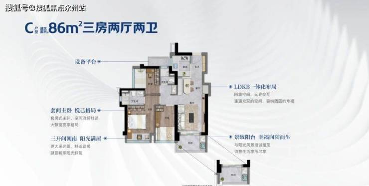 86㎡3房2厅2卫:也是竖厅设计, 进门入户玄关,S墙设计预留冰箱位,U型厨房,餐客厅一体连接阳台,公卫三段式分离,不同的是,三开间朝南,阳台是东南或西南朝向。