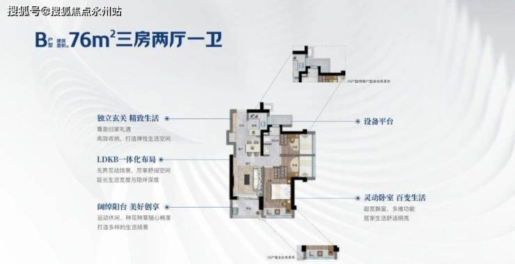 76㎡3房2厅1卫:竖厅设计,进门入户玄关,S墙设计预留冰箱位,U型厨房,餐客厅一体连接阳台,卫生间三段式分离,阳台是朝东北、东南或西南向。