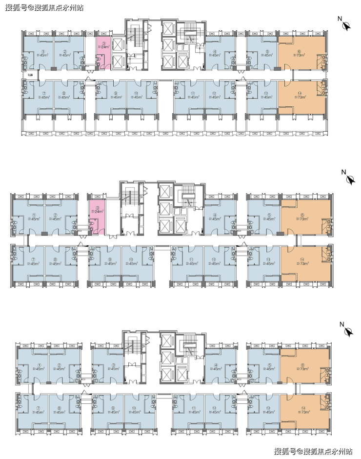 1B栋3T8户(约45㎡/64㎡/87㎡2~3房) 3栋4T12户(约45㎡2房)