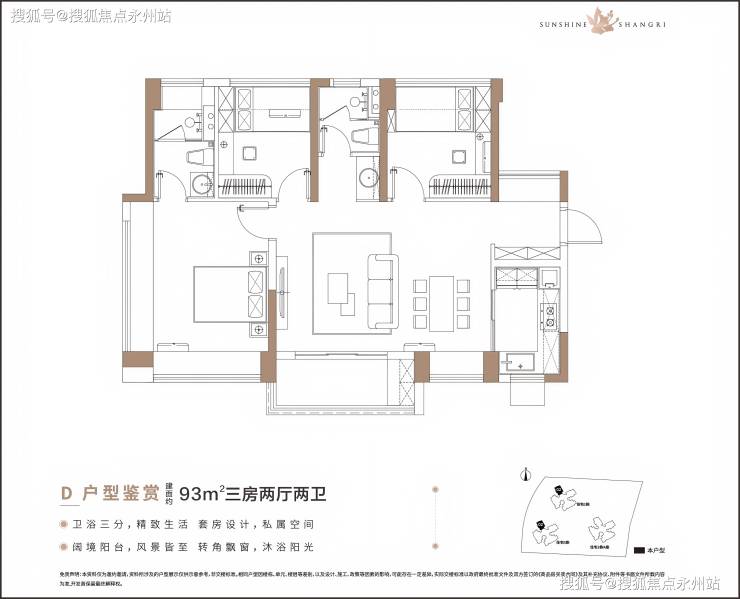 93㎡的3房2厅2卫,1/3栋的02户型,设计的是横厅南北通透格局,客餐厅5.8米开间,LDK一体化设计,3个卧室分别做到了3.2米/2.9米/2.5米的宽度,主卧270°转角飘窗,U型厨房,公卫三段式分离,得房率:76.44%(不含赠送),阳台主朝西南向。